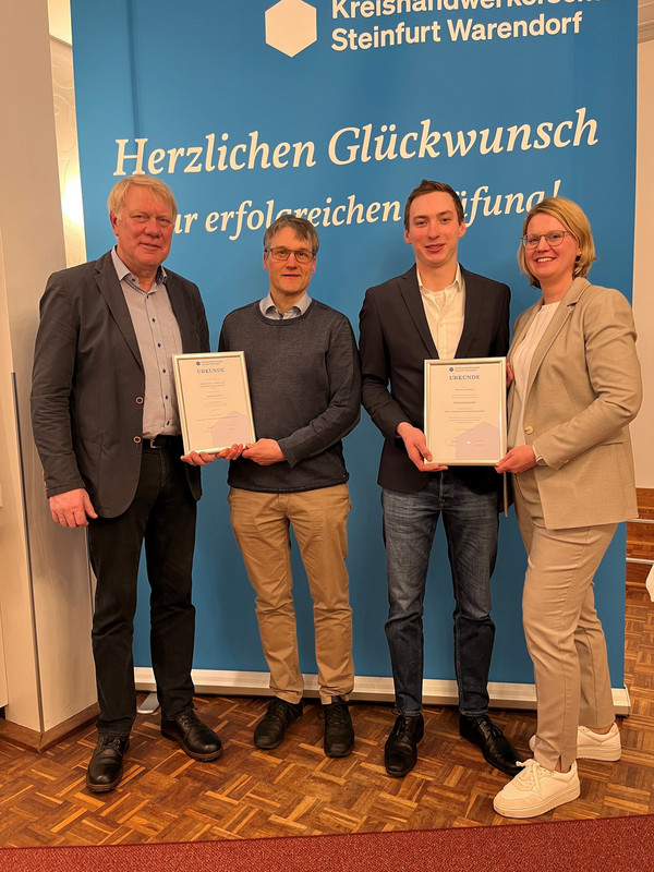 Nach dem Grußwort von Ann-Kristin Erdmann, Bereichsleiterin Innungen der Kreishandwerkerschaft Steinfurt Warendorf, erfolgte die Ehrung des Prüfungsbesten. Ausgezeichnet wurde Felix Henrichmann, ausgebildet im Betrieb Gerdemann J. GmbH & Co. KG, Greven, der in der Gesamtprüfung die höchste Punktzahl erreichte. Ihm sowie seinem Ausbildungsbetrieb wurden Ehrenurkunden und ein Präsent der Innung überreicht.